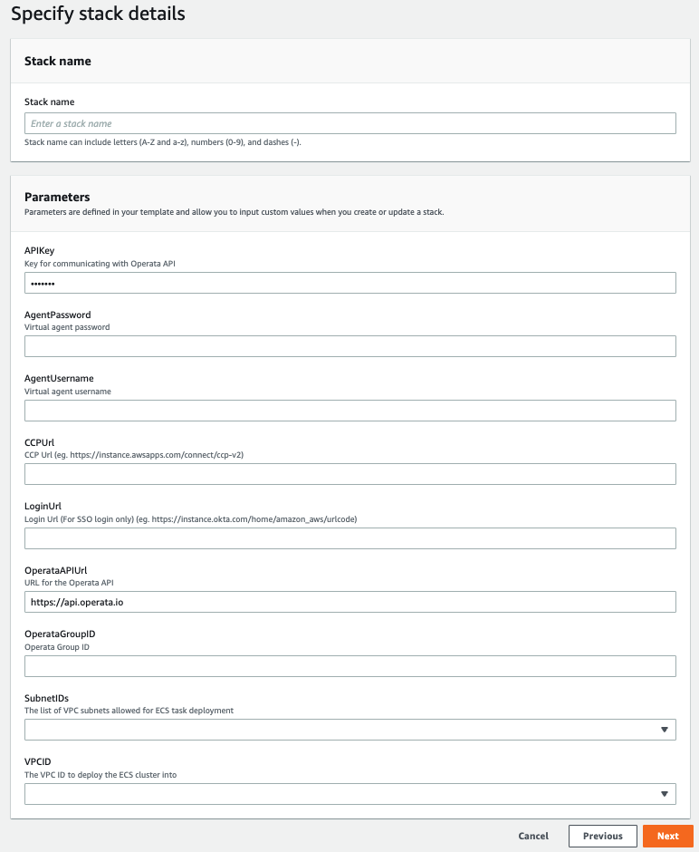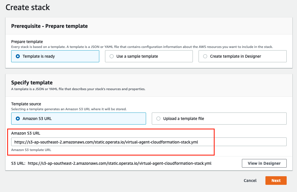 - Input the CloudFormation template URL for the Operata Virtual Agent (Operata will provide this)